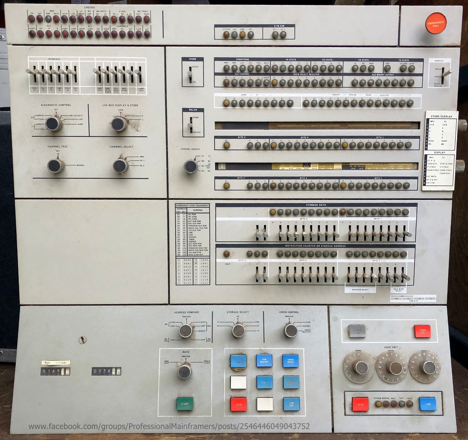 Note that the incorporation of certain features or expansion options may mean a particular actual front panel differs slightly from these illustrations. Also note than some pictures of actual front panels may have incorrectly coloured indicator lamps (round) and/or push buttons (rectangular) or incorrectly labelled rotary switch knobs. Originals were sometimes missing and have been replaced with similar but incorrect substitutes. The (new) illustrations below are correct and agree with the relevant IBM sources.